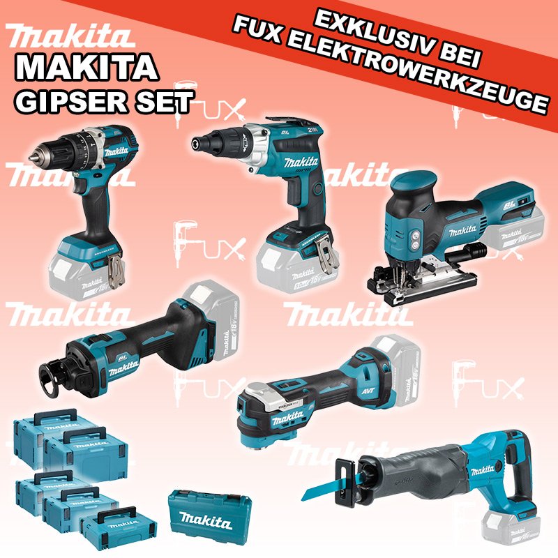 Das Ladenlokal bleibt vom 25. Dezember 2025 bis am 04. Januar 2026 geschlossen. Bestellungen und Lieferungen von Neugeräten werden trotz Ferienabwesenheit in gewohnter Fux-Manier entgegengenommen und ausgeliefert. Zu "Gipser Set" von Makita FUX SPECIAL EXKLUSIV BEI FUX Makita Gipser Set 9 SOLO Bestell- und Artikelnummer: maGipser Set 9 SOLO DHP484ZJ Akku-SchlagbohrschrauberAkkuspannung 18 V Drehzahlen 0-500 / 0-2000 U/min Drehmoment hart / weich 54 / 30 Nm Gewicht 1.6 kgInfos DFS251ZJ Akku-SchrauberAkkuspannung 18 V Drehzahl 0-2500 U/min Werkzeugaufnahme 1/4" (Innensechskant) Gewicht 1.5 kgInfos DTM52Z Multifunktions WerkzeugAkkuspannung 18 V Schwingungen 10000 - 20000 min-1 Werkzeugaufnahme Starlock Max System Gewicht inkl. Akku 2.0 kg Infos DCO181Z Akku-RotationsschneiderAkkuspannung 18 V Leerlaufdrehzahl 32‘000 /min Für 1/4" und 1/8" Werkzeuge Gewicht inkl. Akku 1.7 kgInfos DJR186ZK Akku-SäbelsägeAkkuspannung 18 V Hubzahl 0-2800 / min Schnittleistung Holz 255 mm / Rohre 130 mm Gewicht 3.6 kgInfos DJV18ZJ Akku-StichsägeAkkuspannung 18 V Hubzahl 800 - 3500/ min Schnittleistung Holz 135 mm / Stahl 10 mm Gewicht 2.5 kgInfos MAKPAC Gr. 3Produktabmessung (L x B x H) 377 x 277 x 176 mm Infos Einsatz für DTM52 Einsatz für DTM52 Makpac Koffer Typ C (821551-8) Infos MAKPAC Gr. 1Produktabmessung (L x B x H) 395 x 295 x 110 mm Infos Einsatz für DCO181Einsatz für DCO181 Makpac Koffer Typ A (821549-5)Infos OHNE AKKUS UND LADEGERÄT Standard-Ausrüstung In diesem Set enthalten: DHP484ZJ Akku-Schlagbohrschrauber DFS251ZJ Akku-Schrauber DTM52Z Multifunktions Werkzeug DCO181Z Akku-Rotationsschneider DJR186ZK Akku-Säbelsäge DJV18ZJ Akku-Stichsäge MAKPAC Gr. 3 Einsatz für DTM52 MAKPAC Gr. 1 Einsatz für DCO181 Geliefert im Koffer Zubehör Listenpreis CHF 1'683.00 Fuxpreis CHF 1'140.00 inkl. 8.1% MwSt, inkl vRG Versand CHF 20.00 Kein Grauimport! Produkt bestellen 1 Stück 2 Stück 3 Stück 4 Stück 5 Stück 6 Stück 7 Stück 8 Stück 9 Stück 10 Stück Option: Makita BL 1860 B ( Li-lon Akku ) für CHF 95.- statt CHF 124.-Infos Alle Angaben ohne Gewähr und solange Vorrat reicht!Wiederverkäufer werden? Produkt als PDF AKTION 32%