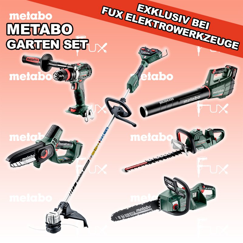 Zu "Garten Set" von Metabo FUX SPECIAL EXKLUSIV BEI FUX Metabo Garten Set 7 SOLO Bestell- und Artikelnummer: Garten Set 7 SOLO FULL Service: 36 Monate zum Nulltarif für Sie! Weitere Infos zum FULL Service Dieses Produkt ist CAS kompatibel! Weitere Infos zu CAS BS 18 LTX BL Q I Akku-BohrschrauberAkkuspannung 18 V Drehzahl 0-550 / 0-2000 U/min Drehmoment hart / weich 130 / 65 Nm Gewicht (mit Akkupack) 2.3 kgInfos MS 18 LTX 15 Akku-AstsägeAkkuspannung 18 V Schnittlänge 15 cm Max. Kettengeschwindigkeit 5 m/s Gewicht ohne Akkupack 1,6 kgInfos LB 18 LTX BL Akku-GebläseAkkuspannung 18 V Luftmenge 650 m³/h Leerlaufdrehzahl 0 - 20300 /min Gewicht (mit Akkupack) 2.5 kgInfos MS 36-18 LTX BL 40 Akku-KettensägeAkkuspannung 18 V Schnittlänge 36 cm Max. Kettengeschwindigkeit 22 m/s Gewicht mit Akkupack 4,6 kgInfos HS 18 LTX BL 55 Akku-Heckenschere Akkuspannung 18 V Schnittzahl bei Leerlauf 3.400 /min Schnittlänge 50 cm Gewicht ohne Akkupack 4,4 kgInfos FSD 36-18 LTX BL 40 Akku-RasentrimmerAkkuspannung 2 x 18 V Schnittkreisdurchmesser 40 cm Leerlaufdrehzahl 0 - 6.000 /min Gewicht (mit Akkupack) 4,3 kgInfos Registriere die in diesem Set vorhandenen Metabo Maschinen auf metabo.ch, und ergattere dir bis zu 5 Gratis Akkus!Zusätzlich offerieren wir zu diesem Set einen Gratis Akku!OHNE AKKUS UND LADEGERÄT Standard-Ausrüstung In diesem Set enthalten: BS 18 LTX BL Q I Akku-Bohrschrauber MS 18 LTX 15 Akku-Astsäge LB 18 LTX BL Akku-Gebläse MS 36-18 LTX BL 40 Akku-Kettensäge HS 18 LTX BL 55 Akku-Heckenschere FSD 36-18 LTX BL 40 Akku-Rasentrimmer Zubehör Listenpreis CHF 1'944.00 Fuxpreis CHF 1'405.00 inklusive 8.1% MwSt Versand CHF 30.00 Kein Grauimport! Produkt bestellen 1 Stück 2 Stück 3 Stück 4 Stück 5 Stück 6 Stück 7 Stück 8 Stück 9 Stück 10 Stück Alle Angaben ohne Gewähr und solange Vorrat reicht!Wiederverkäufer werden? Produkt als PDFVideo LiHD 1Video LiHD 2 AKTION 27%