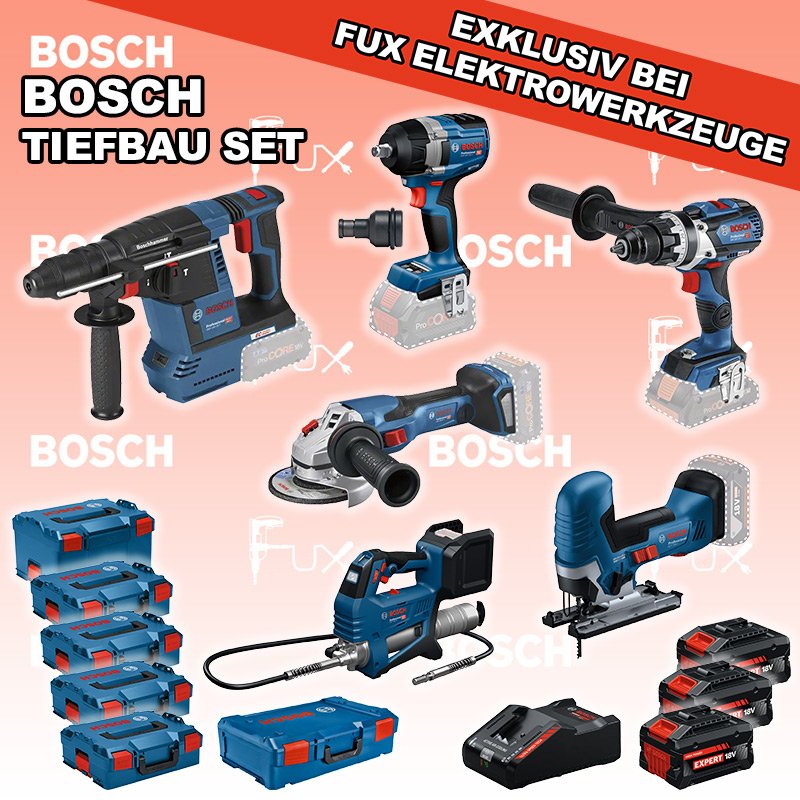 Zu "Bau / Tiefbau Set" von Bosch Professional FUX SPECIAL EXKLUSIV BEI FUX Bosch Professional Tiefbau Set 2 Bestell- und Artikelnummer: BOTiefbau Set 2 GSR 18V-110 C Akku-BohrschrauberAkkuspannung 18 V Drehzahlen 0-480 / 0-2100 U/min Drehmoment weich / hart / max. 47 / 85 / 110 Nm Gewicht 2.2 kgInfos GBH 18V-26 F Akku-BohrhammerAkkuspannung 18 V Einzelschlagstärke 2.6 J Bohrleistung in Beton 4 - 26 mm Gewicht Netto 3.0 kgInfos GST 18V-125 S Akku-StichsägeAkkuspannung 18 V Hubzahl bei Leerlauf 500 - 3500 min⁻¹ Hubhöhe 26 mm Gewicht exkl. Akku 1.9 kgInfos GWS 18V-15 C Akku-Winkelschleifer BiturboAkkuspannung 18 V Leerlaufdrehzahl 11000 U / min 125 mm Scheiben Gewicht inkl. Akku 3.2 kg Infos GDS 18V-750 C Akku-DrehschlagschrauberAkkuspannung 18 V Drehzahlen 0 - 2400 min⁻¹ Drehmoment, max. 750 Nm Gewicht exkl. Akku 1.7 kgInfos GFP 18V-10 Akku-KartuschenpresseAkkuspannung 18 V Druck max. 9’999.9 psi Durchflussmenge bis 320 g/minInfos Reduktions Adapter 1/2" auf 1/4" Aufnahme Max. 350 Nm Länge 45 mmInfos 3x EXBA18V-80 + EXAL18V-160 Starter-Set3 x EXBA18V-80 Akkupack EXAL18V-160 LadegerätInfos Standard-Ausrüstung In diesem Set enthalten: GSR 18V-110 C Akku-Bohrschrauber GBH 18V-26 F Akku-Bohrhammer GST 18V-125 S Akku-Stichsäge GWS 18V-15 C Akku-Winkelschleifer Biturbo GDS 18V-750 C Akku-Drehschlagschrauber GFP 18V-10 Akku-Kartuschenpresse Reduktions Adapter 3x EXBA18V-80 + EXAL18V-160 Starter-Set Geliefert im Koffer Zubehör Listenpreis CHF 2'805.00 Fuxpreis CHF 2'076.00 inklusive 8.1% MwSt Frankolieferung Kein Grauimport! Produkt bestellen 1 Stück 2 Stück 3 Stück 4 Stück 5 Stück 6 Stück 7 Stück 8 Stück 9 Stück 10 Stück Alle Angaben ohne Gewähr und solange Vorrat reicht! Produkt als PDF NEUHEITAKTION 25%