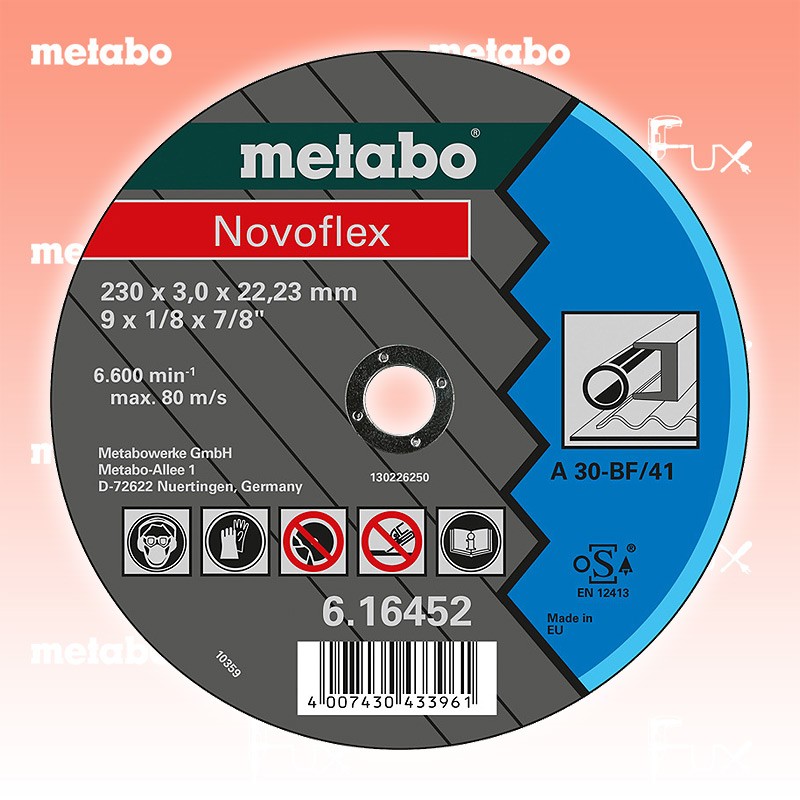 Zu "Qualitätsklasse A 30 Trennscheiben" von Metabo Metabo Trennscheibe Stahl 230 mm Bestell- und Artikelnummer: 616452000 Qualität Novoflex: leistungsfähige Einstiegsklasse Härte: mittelhart Universell einsetzbar in der Metallverarbeitung Gute Schnittleistung bei hoher Standzeit. Maximale Arbeitsgeschwindigkeit 80 m / s Arbeitshöchstgeschwindigkeit 80 m / s Technische Daten Güteklasse A 30 Durchmesser x Dicke x Bohrung 230 x 3 x 22,23 mm Ausführung gerade Maximale Geschwindigkeit 6600 / min Standard-Ausrüstung Verkaufseinheit 25 Stk. Listenpreis CHF 125.00 Fuxpreis CHF 106.00 inkl. 8.1% MwSt, inkl vRG Frankolieferung Kein Grauimport! Produkt bestellen Verkaufseinheit 25 Stk. 1 Stück 2 Stück 3 Stück 4 Stück 5 Stück 6 Stück 7 Stück 8 Stück 9 Stück 10 Stück 11 Stück 12 Stück 13 Stück 14 Stück 15 Stück 16 Stück 17 Stück 18 Stück 19 Stück 20 Stück 21 Stück 22 Stück 23 Stück 24 Stück 25 Stück 26 Stück 27 Stück 28 Stück 29 Stück 30 Stück 31 Stück 32 Stück 33 Stück 34 Stück 35 Stück 36 Stück 37 Stück 38 Stück 39 Stück 40 Stück 41 Stück 42 Stück 43 Stück 44 Stück 45 Stück 46 Stück 47 Stück 48 Stück 49 Stück 50 Stück Alle Angaben ohne Gewähr und solange Vorrat reicht!Wiederverkäufer werden?Lehrlingsrabatt? Produkt als PDF AKTION 15%